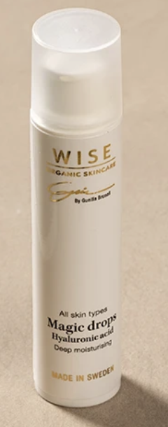 WISE Magic Drops – Hyaluronc Acid är ett fuktserum att använda alla dagar i veckan under kräm, ansiktsolja, face balm och dagkräm, för att inte tala om – under Glow mask. Hyaluronsyra är ett kroppseget ämne som avtar med åren, med detta serum fyller du på fuktdepåerna på djupet och får en slätare och fylligare hy. WISE Magic Drops – Hyaluronic Acid har i år vunnit två första priser i internationella tävlingar. Bästa serum i Nordic Natural Beauty award. Bästa serum också i London Beauty short list 2022 och 2021 och blev även Årets produkt i Stockholm Beauty week-tävlingen 2021.